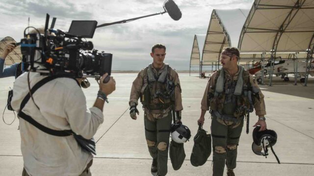The cockpit cameras were the core of the aerial filming because they caught the actuality, but filming jet-to-jet is supremely dangerous and just couldn’t be done with students so we had to shoot the big aerial scenes with instructor pilots. For this specialist cinematography we teamed up with Kevin LaRosa and Michael FitzMaurice who had worked on the movie Top Gun: Maverick. We wanted to film some shots using a chase jet rigged with Sony Venus 2 camera for scenes, but also have some days using a helicopter – which would capture the sense of speed and enable us to get the close up footage.